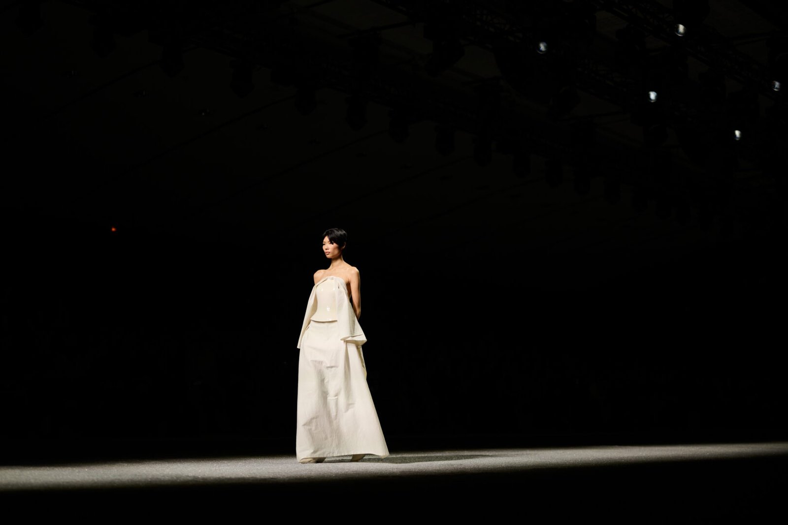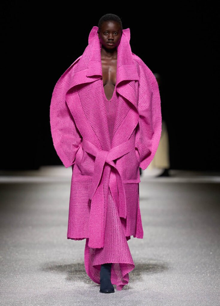 Paris, Vendredi 6 mars 2026. C’est au Carrousel du Louvre, comme il y a 20 ans pour les connaisseurs, qu’Issey Miyake présente son défilé automne-hiver 2026-2027. Dans une salle plongée dans l’obscurité, des bancs encerclent un immense podium rectangulaire recouvert de minéraux argentés. Tout d’un coup, du plafond tombent trois fins filets de pluie, tandis que le duo Herbert et Momoko lance une performance musicale de l’autre côté de la salle. C’est dans ce décor presque irréel que les premières silhouettes se dévoilent lentement au public. Sur le podium, les mannequins avancent à un rythme volontairement ralenti, imposant une cadence hypnotique. Les premiers looks gris monochromes, contrastent peu à peu avec des touches de couleurs vives — trenchs colorés (violet, rose, bleu), plissés éclatants et corsets aux teintes intenses — qui dynamisent cette palette sobre. Le temps semble s’étirer, laissant aux spectateur·rice·s la possibilité d’examiner chaque détail des 52 silhouettes imaginées par Satoshi Kondo pour la maison japonaise.